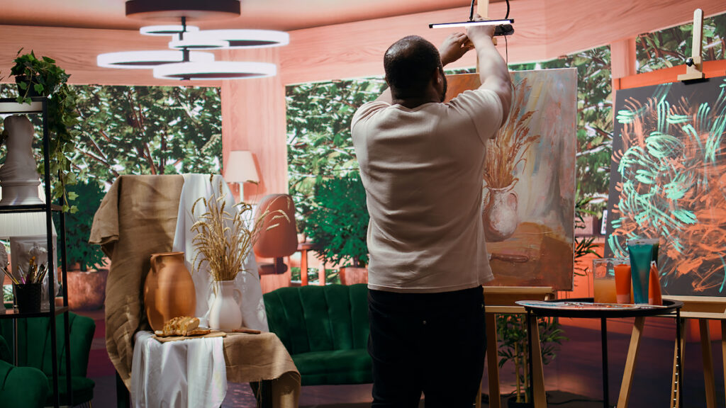 Choose a background that complements, not competes, with your artwork’s colors. Think soft tones that highlight the art’s personality.