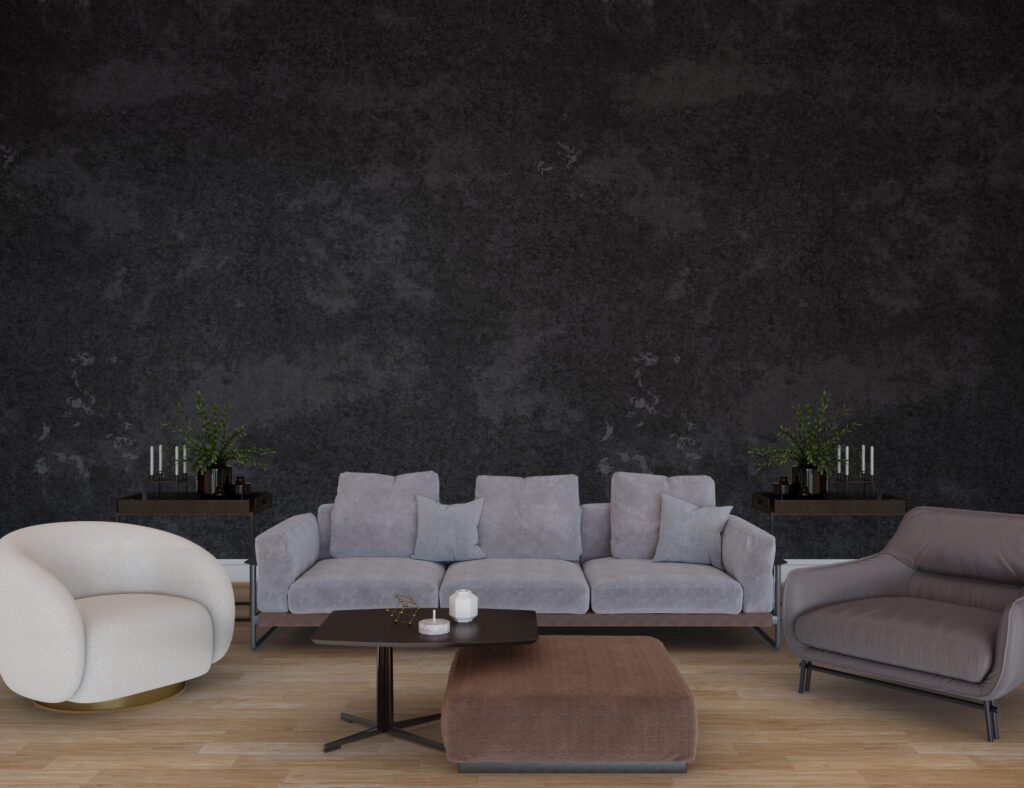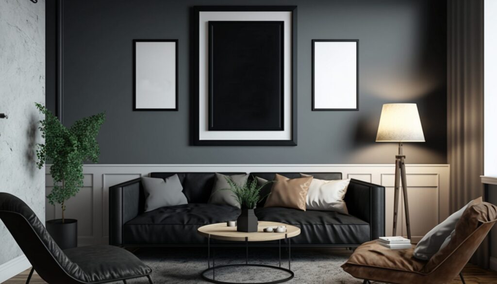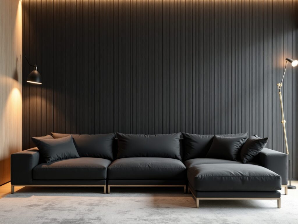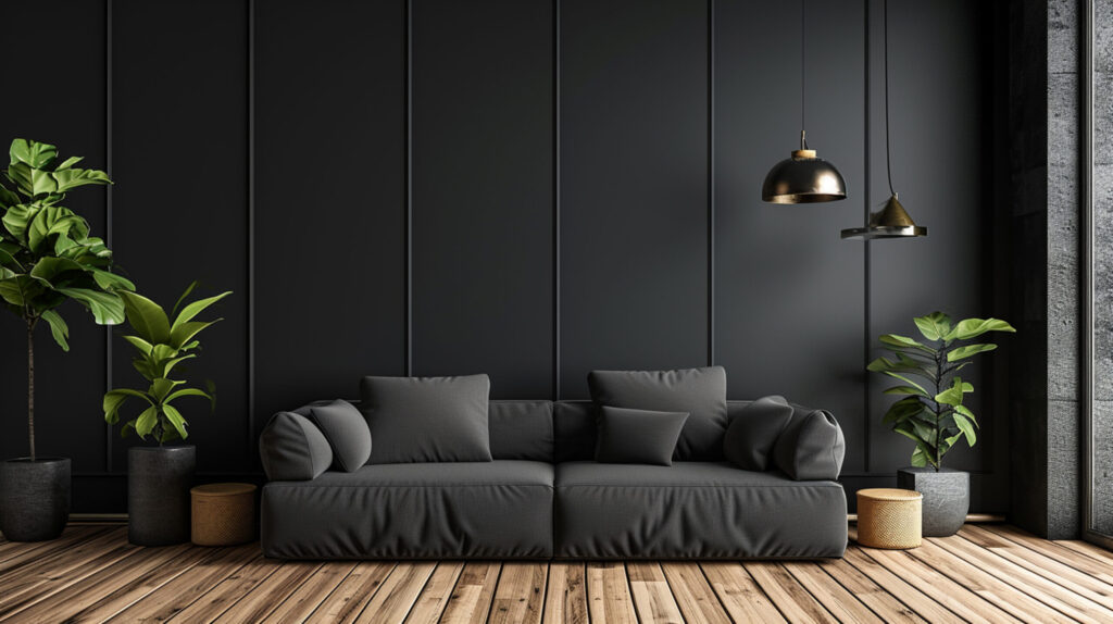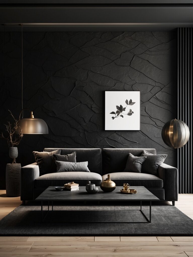A single black accent wall behind the sofa instantly anchors the room and draws attention to the seating area.