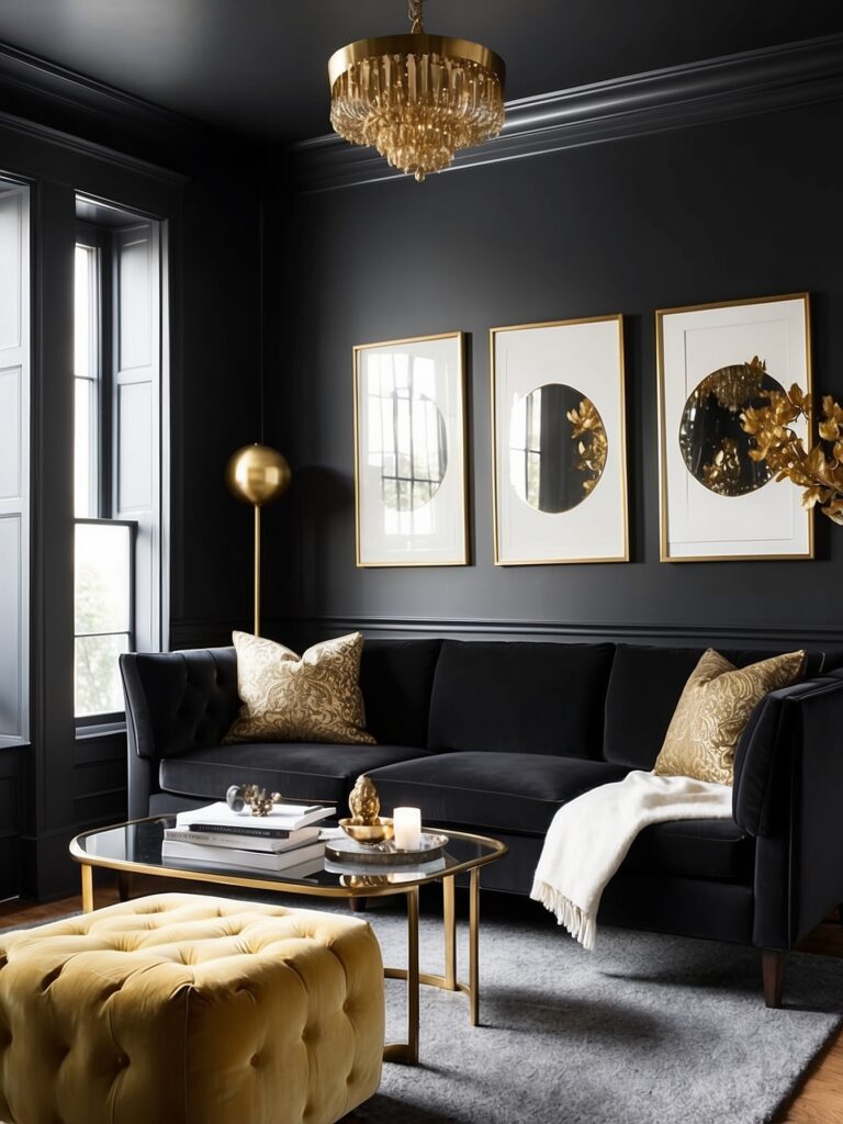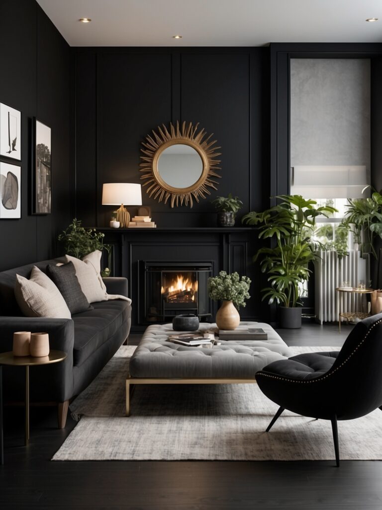 Black living room walls pair well with white, beige, gray, wood tones, brass, gold, and greenery. These colors add contrast and warmth, preventing the space from feeling too dark.