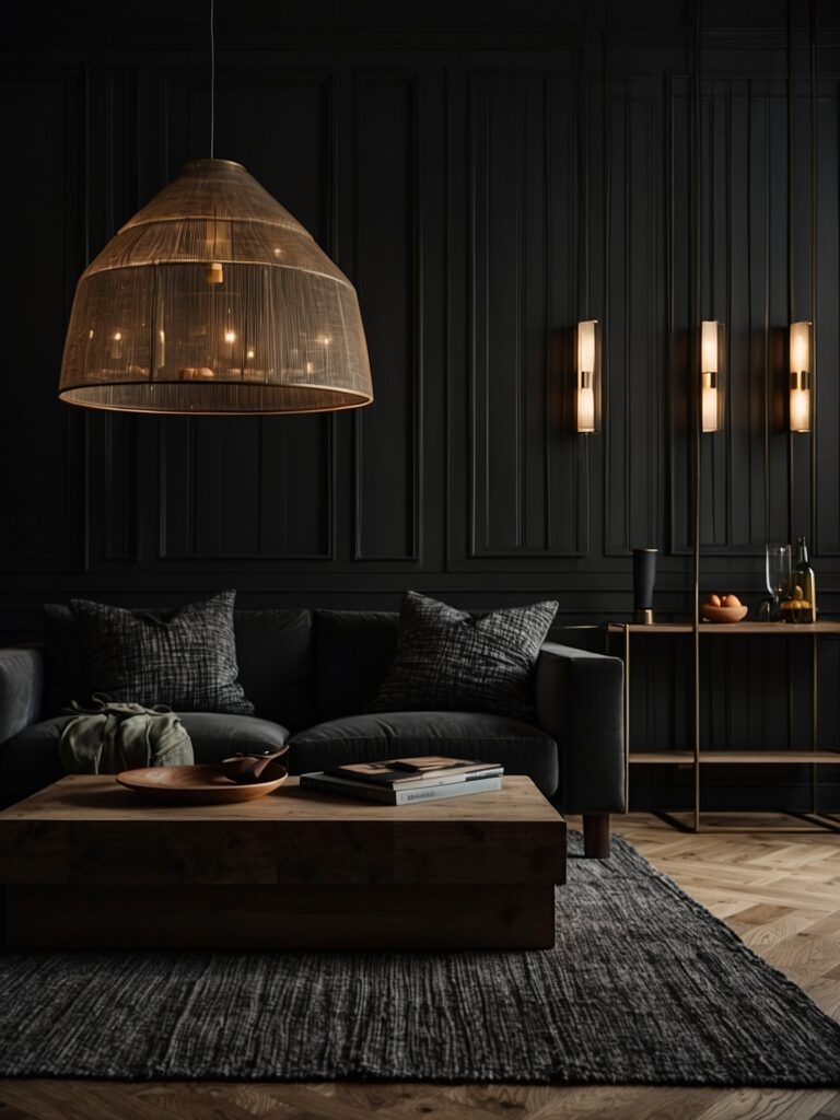 Use floor lamps, sconces, and warm bulbs to balance black walls.