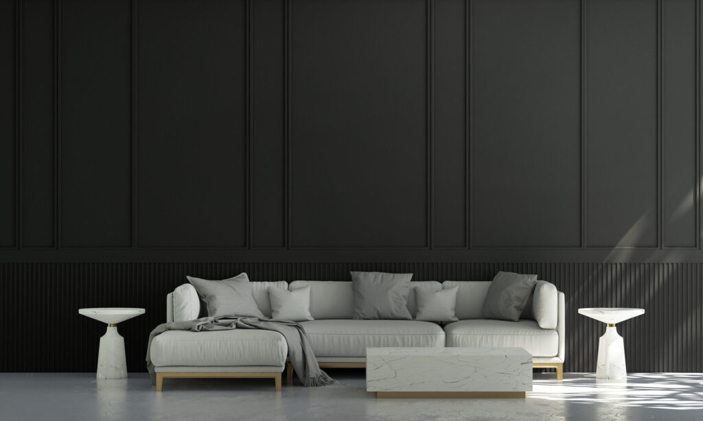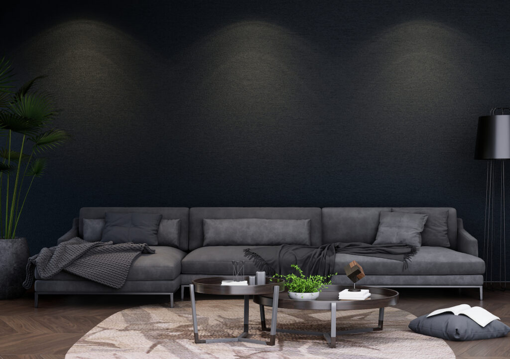 Light gray, beige, or cream furniture offsets black walls beautifully.