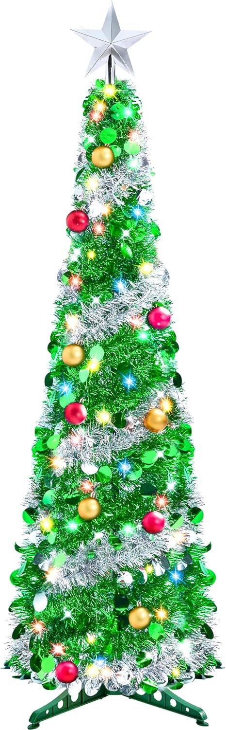 This compact, foldable Christmas tree is ideal for nooks and crannies or apartments. The tinsel finish provides a festive glitter, and the pop-up design with built-in lights makes setup quick, simple, and mess-free.