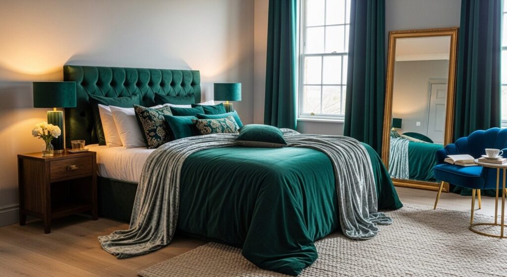Velvet adds instant luxury. Select velvet sticky pillows or a velvet blanket in dark shades such as emerald, navy, or plum.
