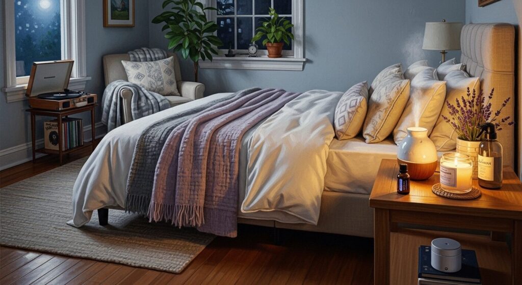 Use essential oil diffusers, lavender candles, or linen sprays for a soft aroma. Add calming music or a white noise machine for a peaceful background.