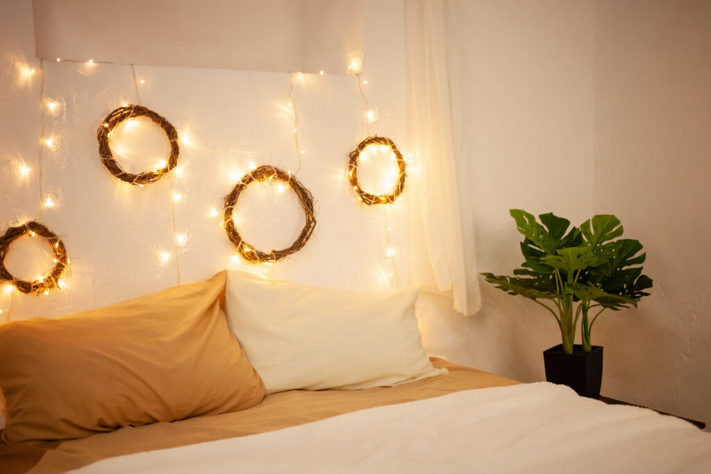 Avoid harsh overhead lights. Rather, turn on soft bedside lamps, string lights, or bulbs with warm colors to produce a calming effect. Layered lighting also allows you to adjust the brightness level according to your mood.