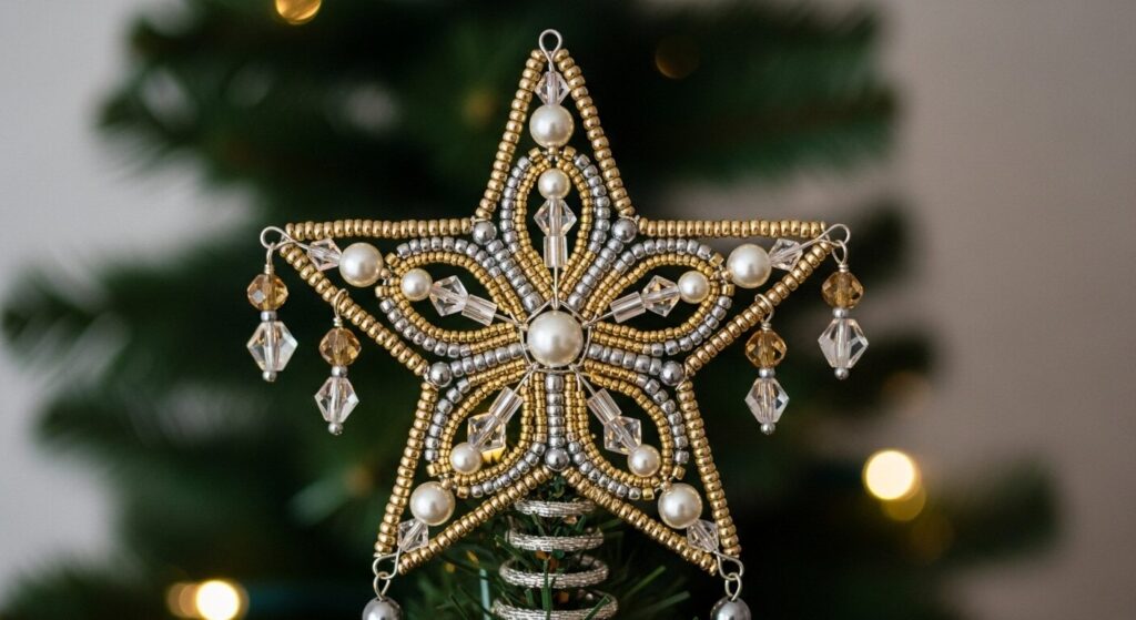 Handcrafted toppers bring personal warmth to your holiday setup. A beaded star topper adds shimmer while showing off your creative side.
