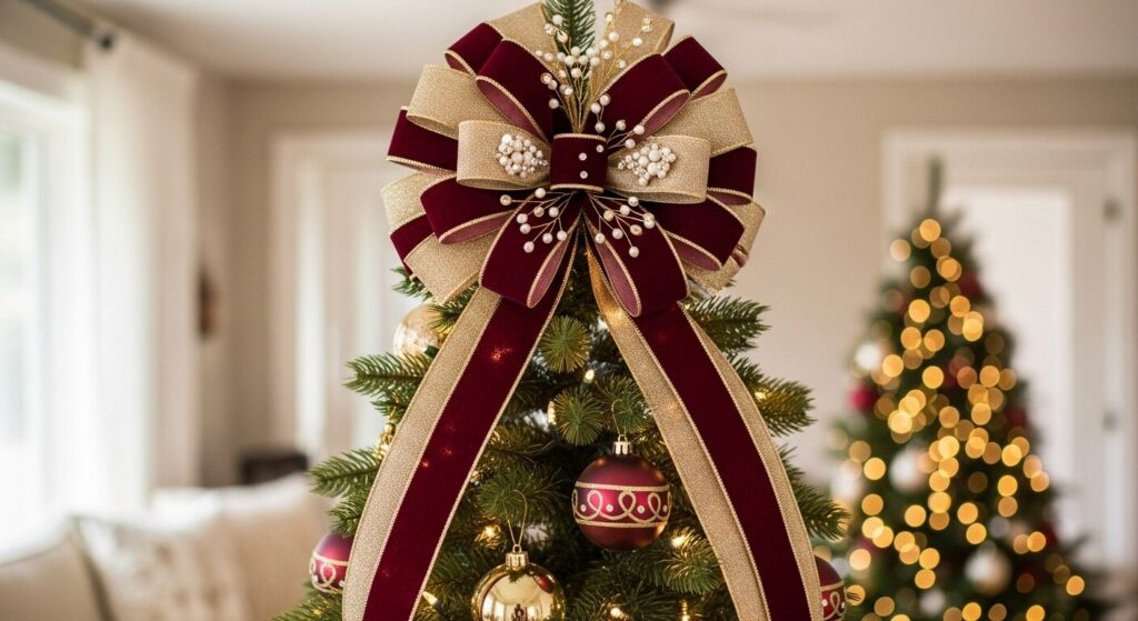 Arrange the loops to create volume, and let soft ribbon tails fall gently over the tree. It’s an easy DIY look that feels high-end without much effort — a true holiday showstopper.