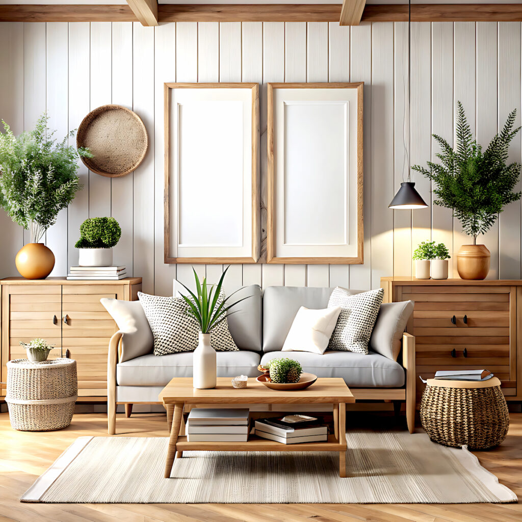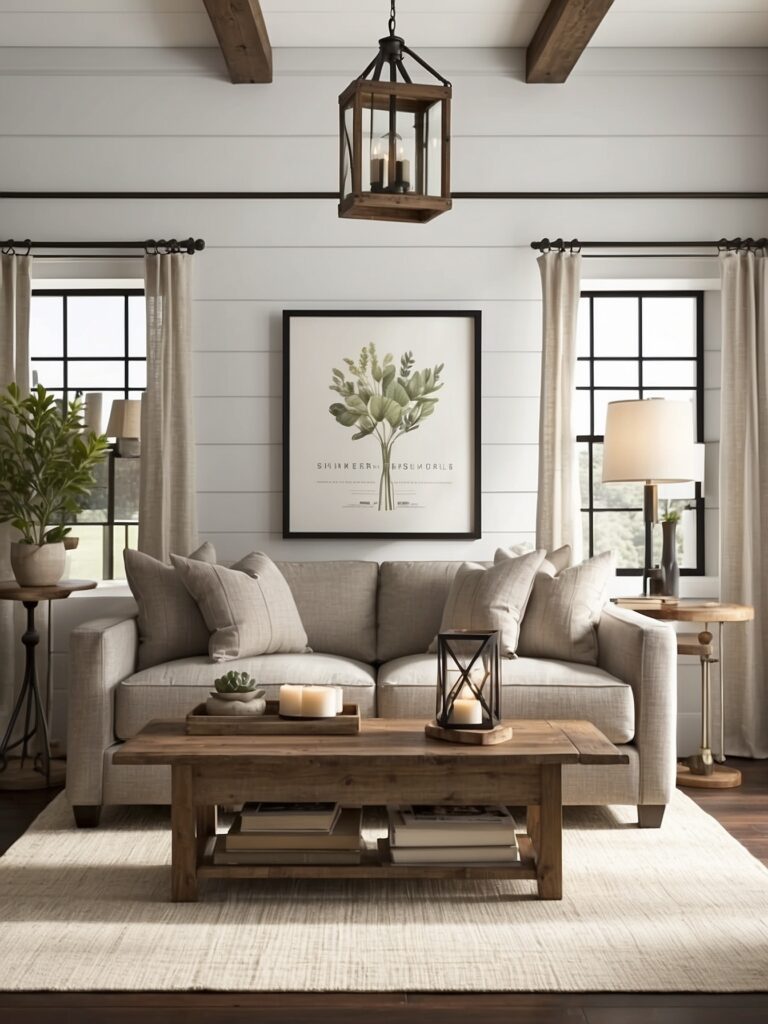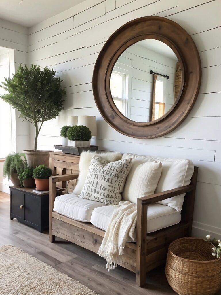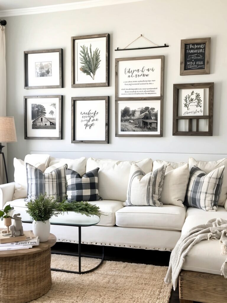 Use shiplap accent walls, reclaimed-wood art, neutral wall prints, floating shelves, and farmhouse mirrors, while keeping the spacing clean and uncluttered.