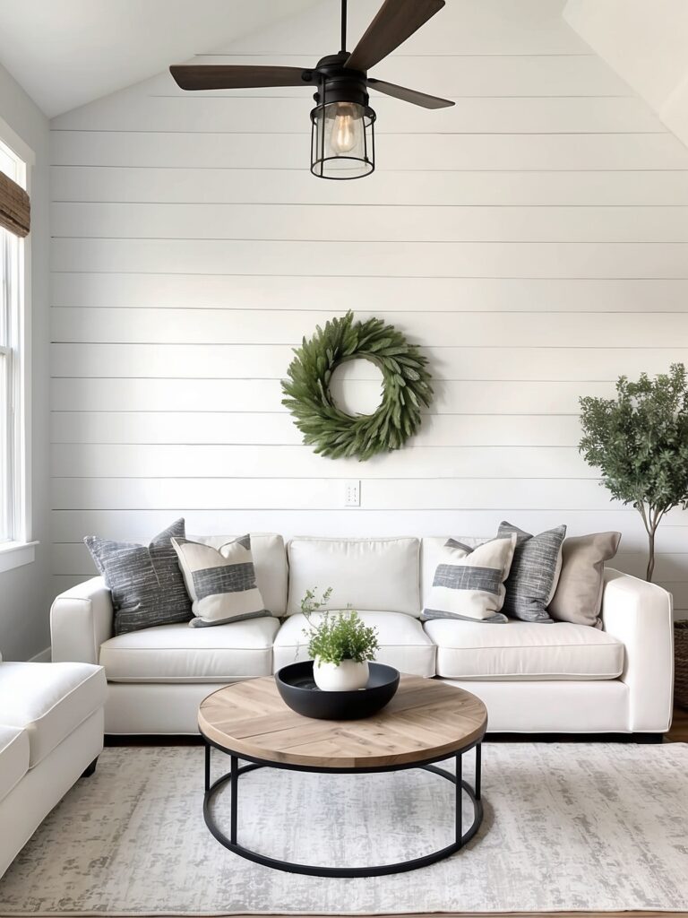 Shiplap, wood panels, or subtle texture behind the sofa creates a strong focal point.