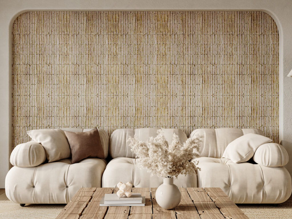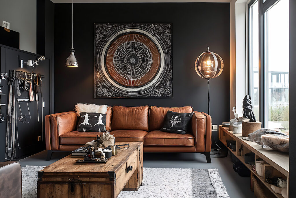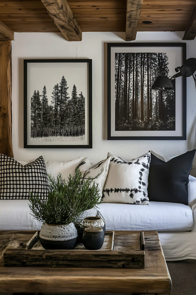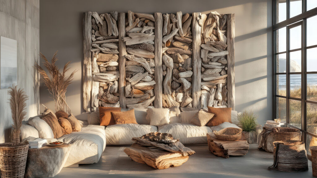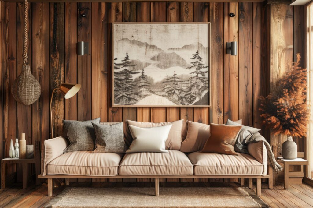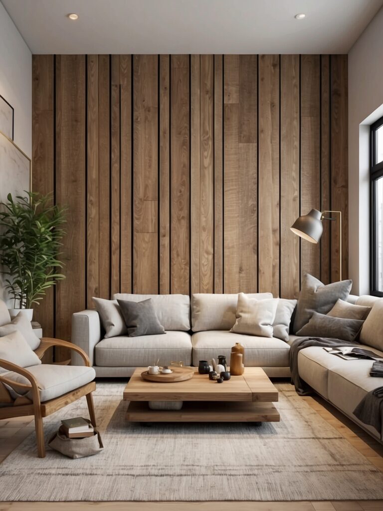 Reclaimed wood wall art adds warmth and character, instantly softening modern living rooms.
