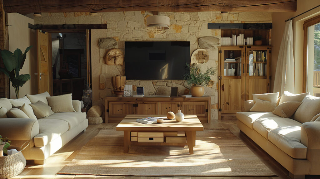 Combining white walls with warm wood decor keeps the living room fresh and welcoming.
