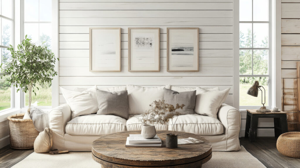 Modern farmhouse wall decor combines rustic textures like wood and shiplap with clean lines and neutral colors to create a cozy yet refined living room.