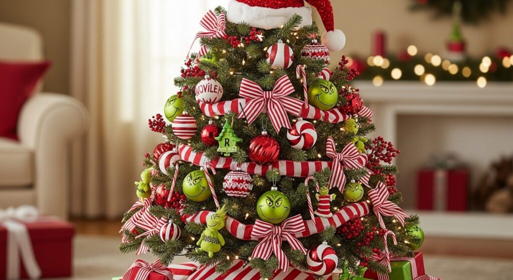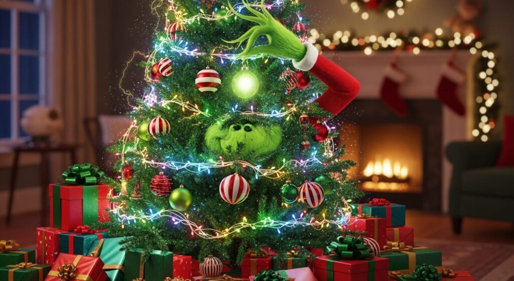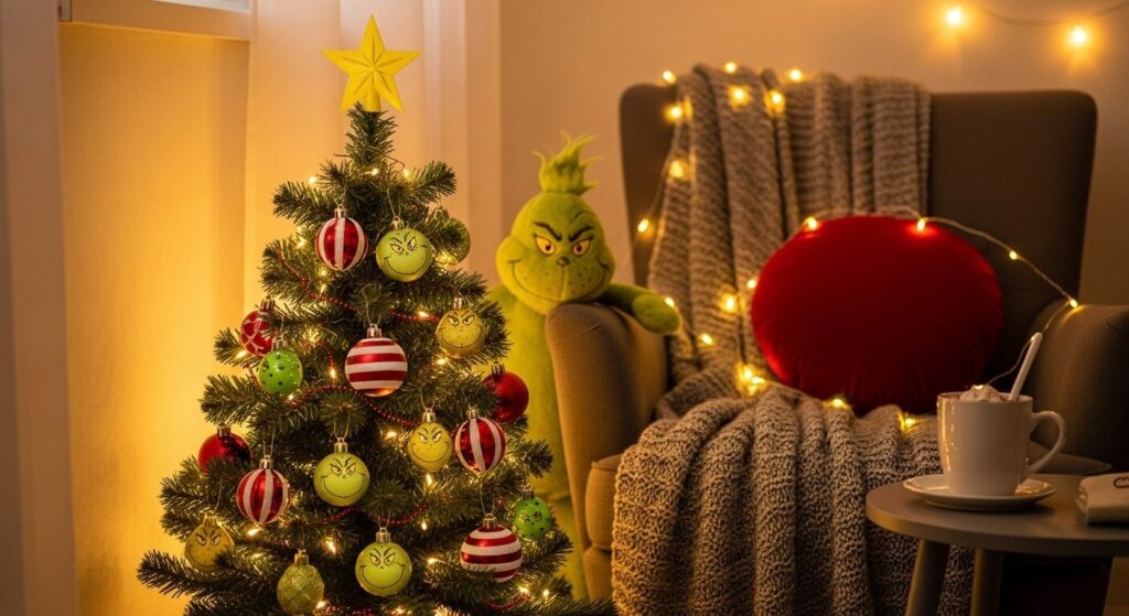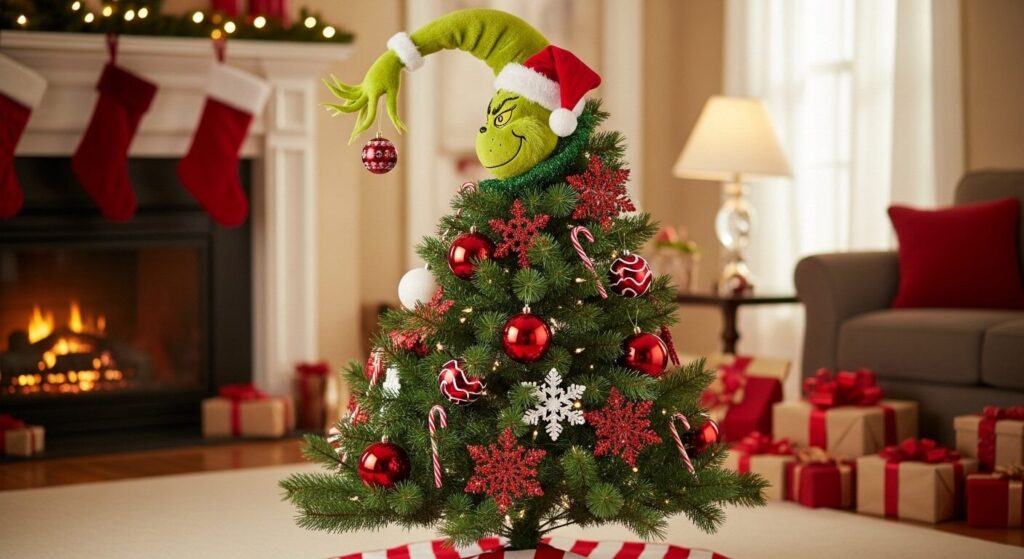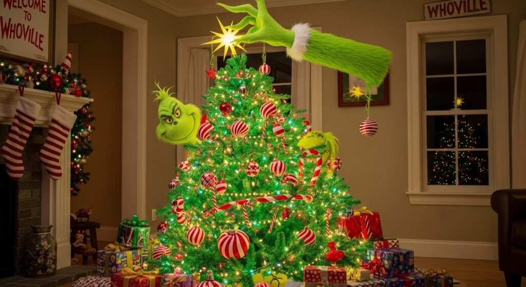 A Grinch tree topper isn’t just a decoration—it’s the crown of your creation! Choose a giant red Santa hat, a curly ribbon star, or even a stuffed Grinch plush to finish your look.