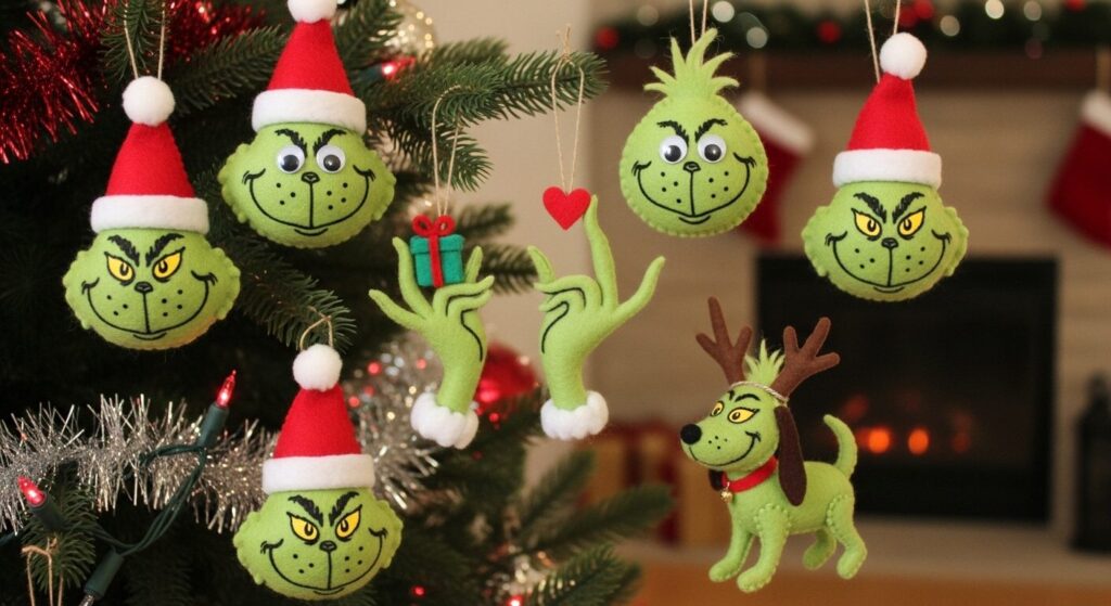 Add a personal touch by crafting your own Grinch ornaments. Use felt, glitter, or even green paper to make little faces and hearts that say, “Merry Grinchmas!”