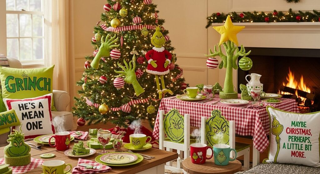 What’s Christmas without a little laughter? A Grinch Christmas decor theme brings both giggles and warmth. Pair your tree with whimsical table settings, cozy throw pillows, and festive mugs.