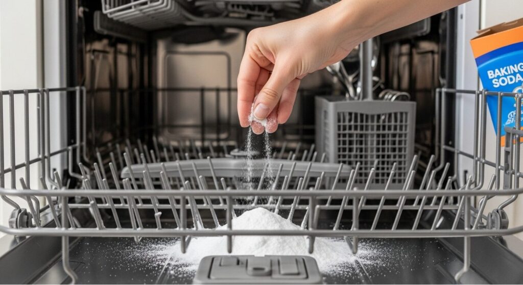 - Scatter 1 cup of baking soda on the base of the dishwasher.