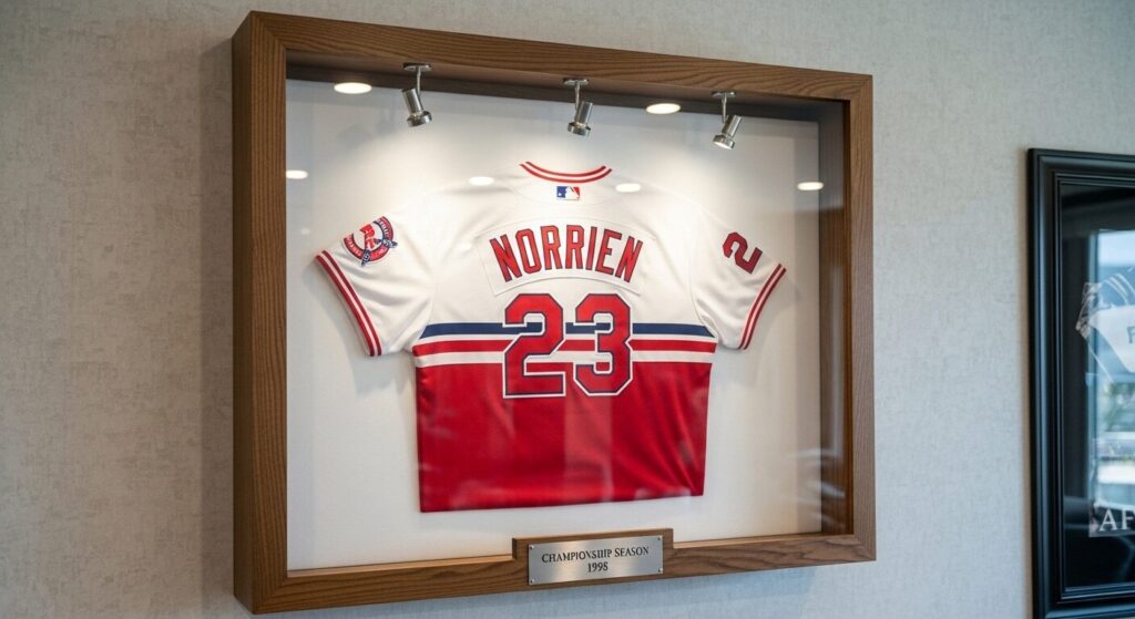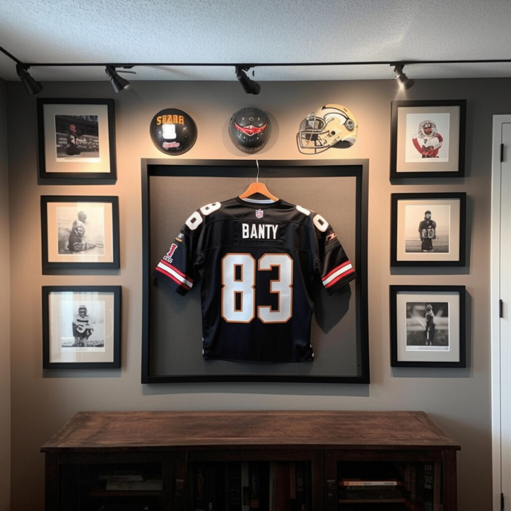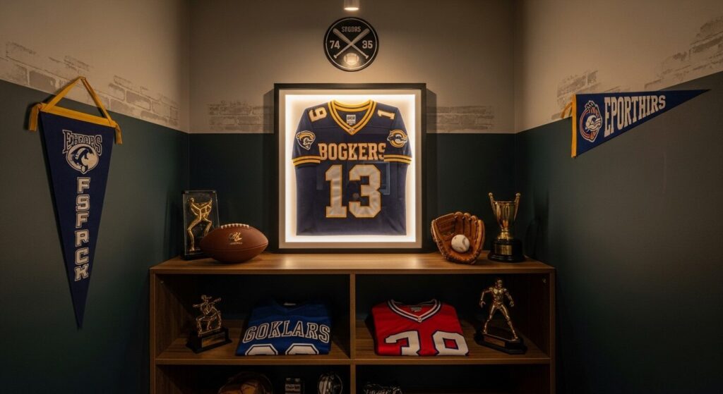 You can even paint the background wall with team colors or add vinyl decals. It’s one of the most fun jersey display styles because it lets your passion shine in a cozy space.