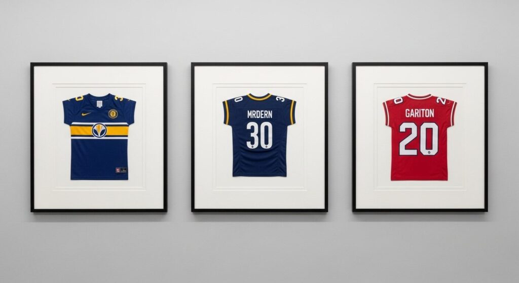 Arrange jerseys in various frame sizes and mix in team posters or framed quotes. The goal is to create a visually balanced, artistic display that feels like a curated exhibit.