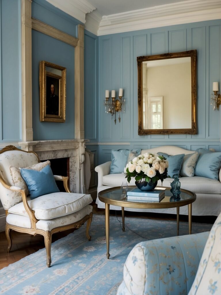 Soft gray furnishings or rugs paired with light blue walls create a refined, calming space.