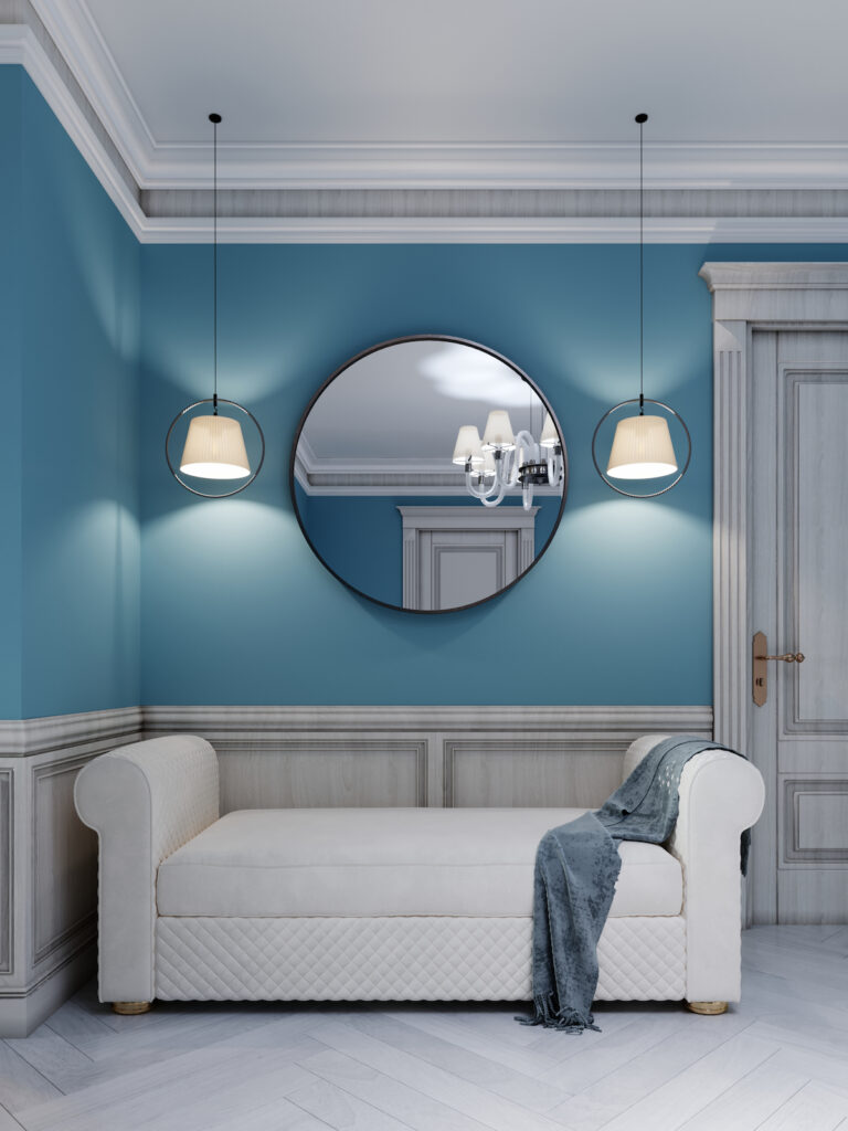 Bold art or oversized gallery walls stand out against serene blue walls, creating visual interest.