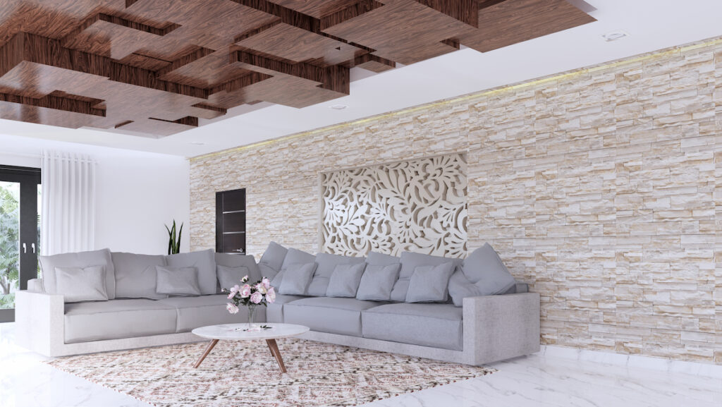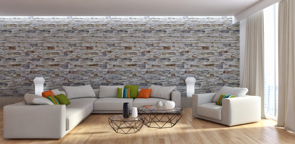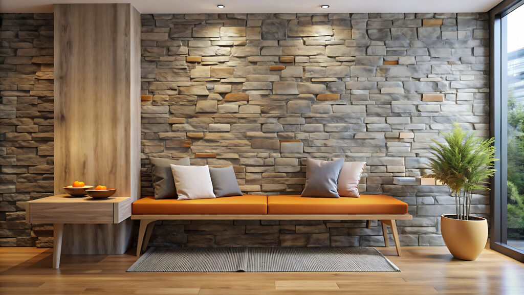 Neutral shades like white, beige, gray, taupe, and soft wood tones pair beautifully with stone walls, allowing the texture to stand out while maintaining harmony.