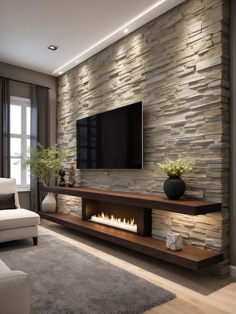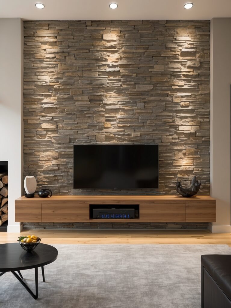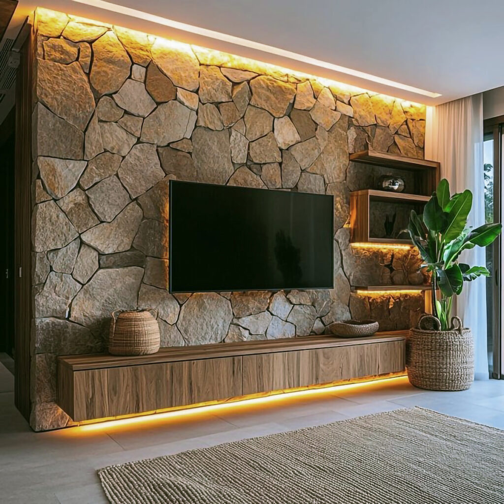 Use a stone wall behind the TV and add hidden storage or floating shelves to create a sophisticated media area.