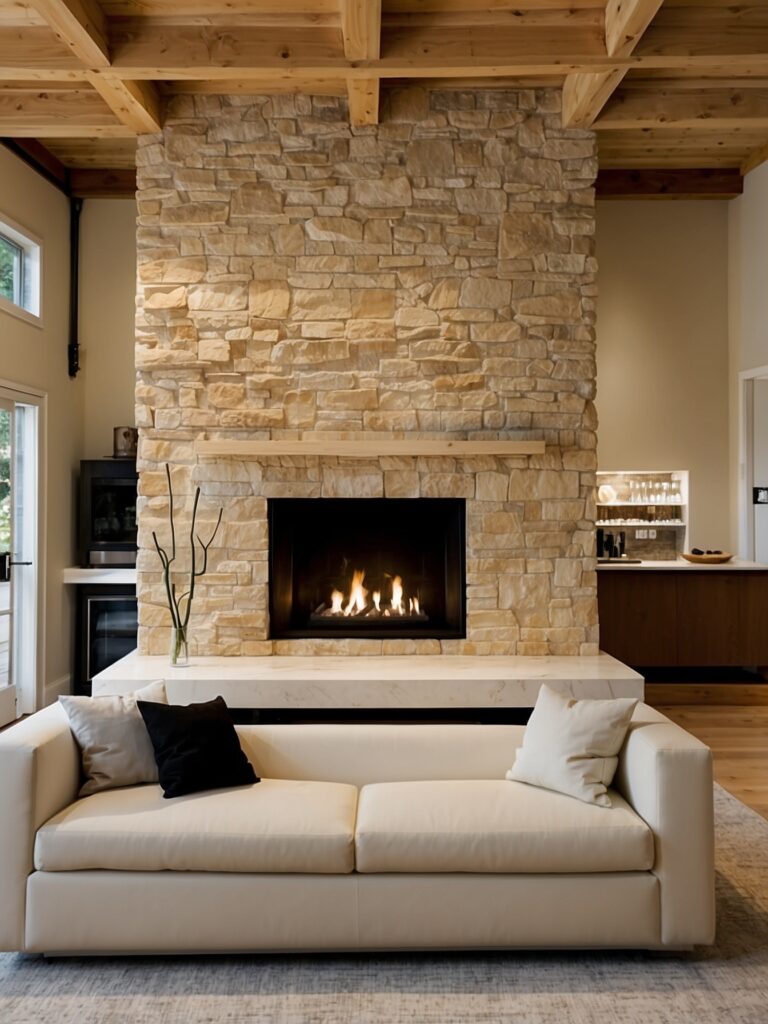 Stacked stone in neutral tones brings dimension and a tactile feel. It anchors the room while keeping the look clean and contemporary.