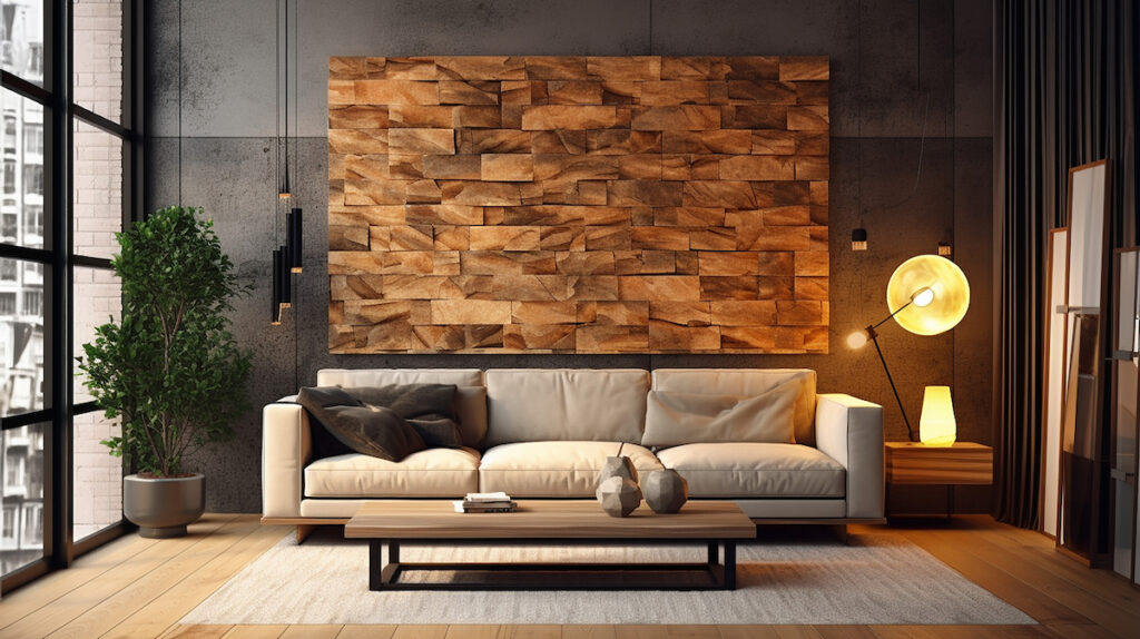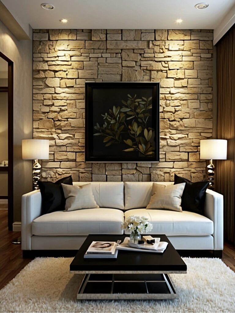 A stone wall behind your sofa turns that area into a deliberate focal point without extra décor.
