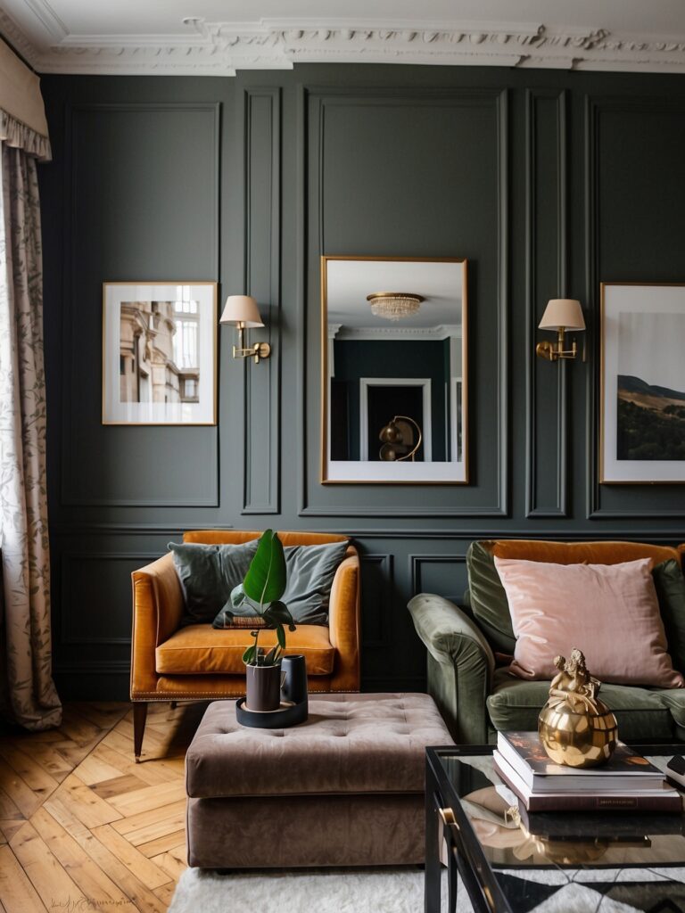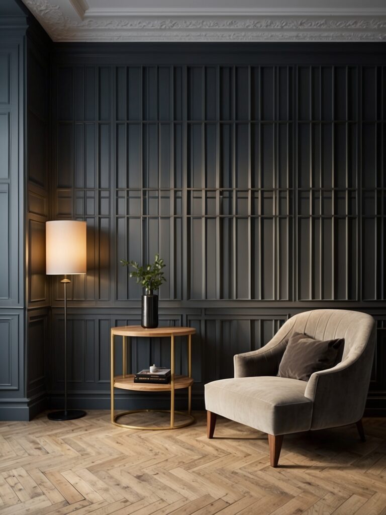 Deep charcoal or muted navy panelling adds drama while keeping the room cohesive.
