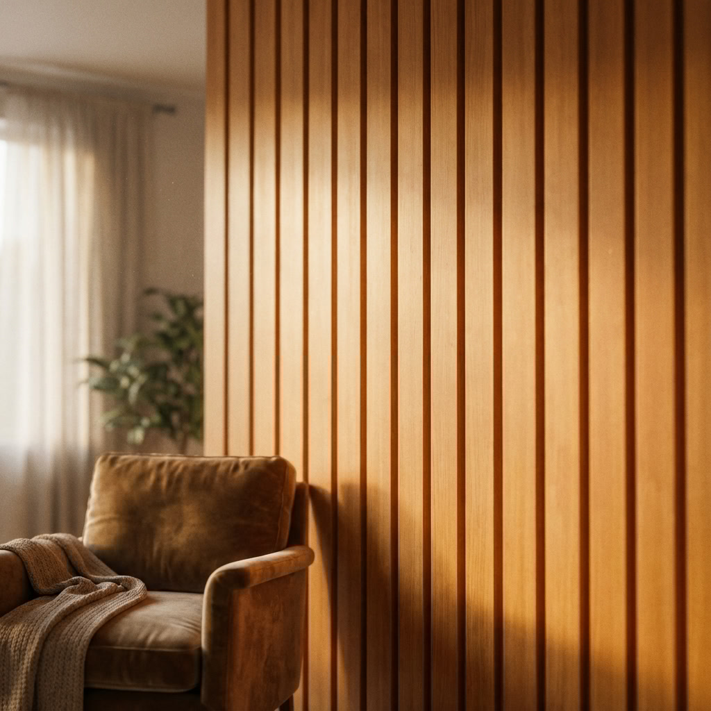 Vertical slatted panels bring rhythm and height to walls while offering a subtle texture that suits Scandinavian and modern interiors.