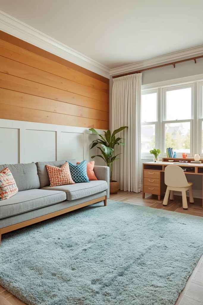 Half-wall panelling, often paired with contrasting paint above, creates dimension while anchoring lower walls.
