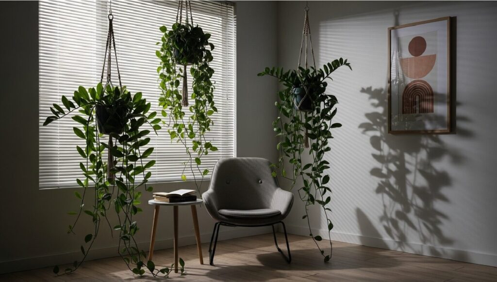 • Bathroom or kitchen: Hang ferns or ivy where humidity is naturally higher — they’ll thrive, and the trailing effect softens the space.