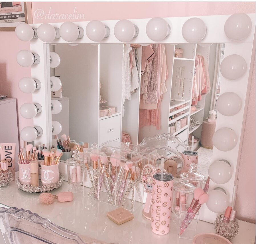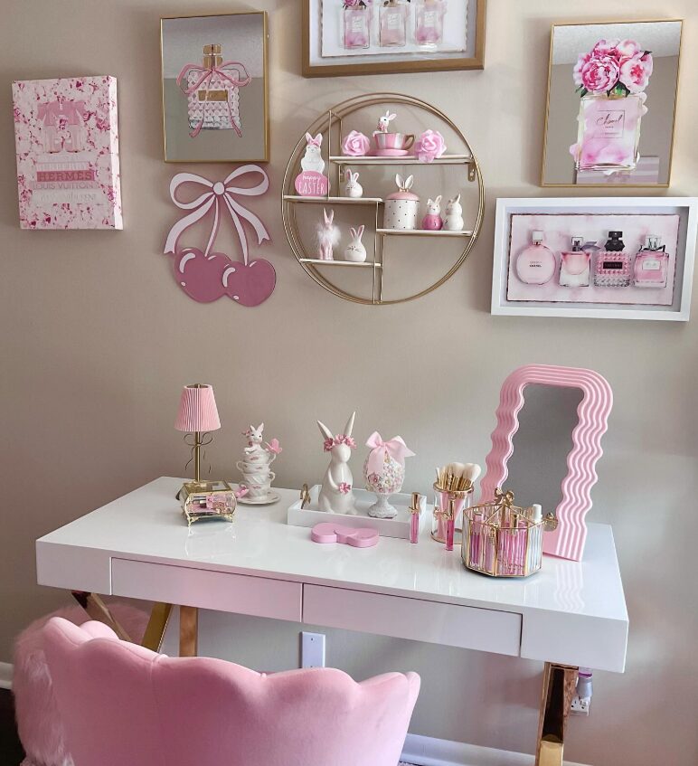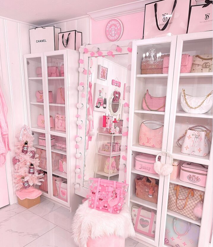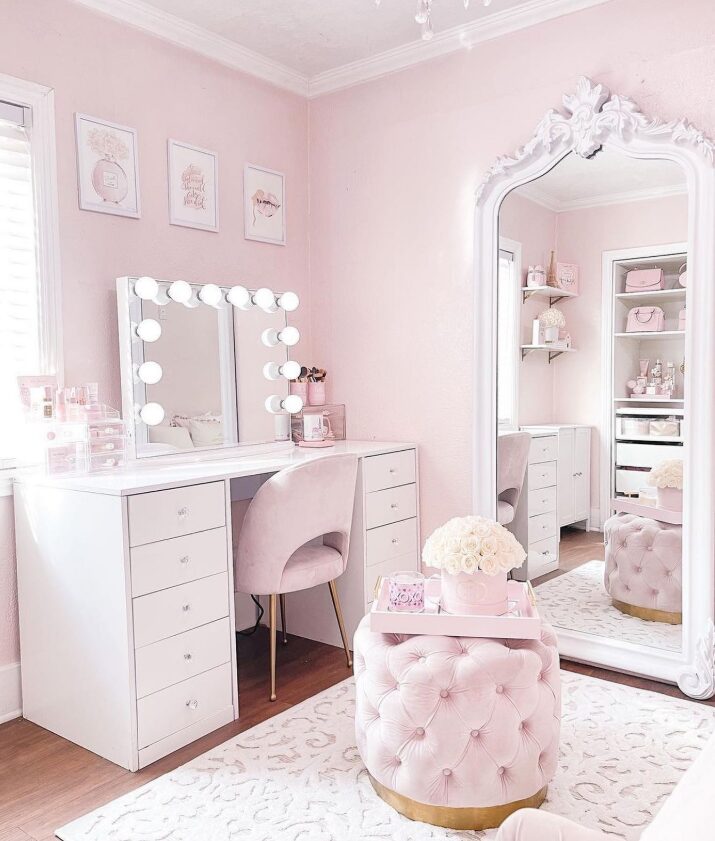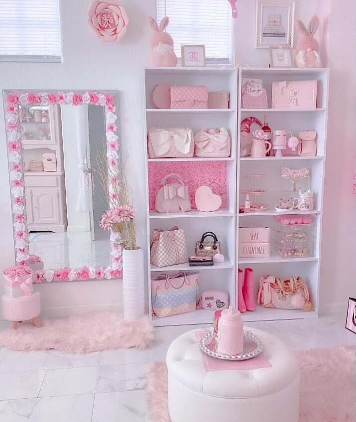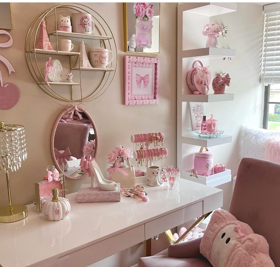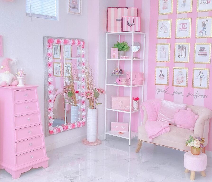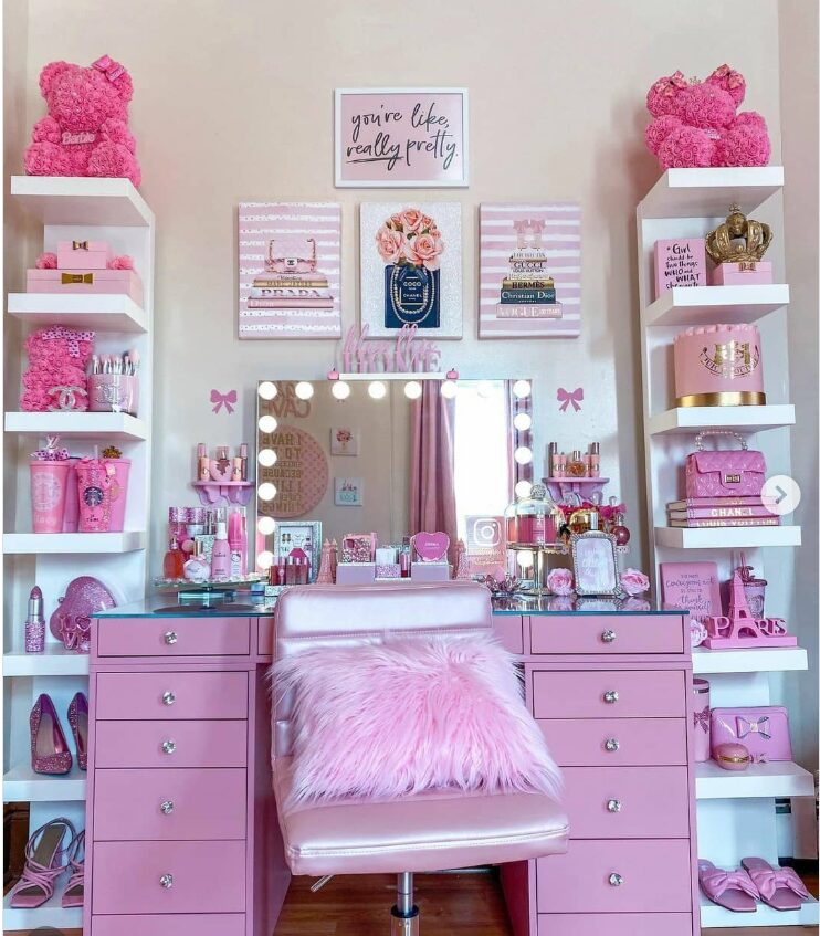 It’s a practical yet stunning take on pink aesthetic beauty room décor — blending utility with charm.