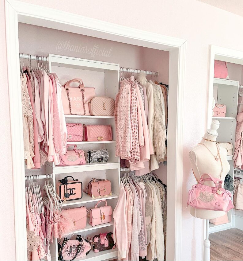 Using coordinated pastel wardrobes and chic display practices — like garment rails and statement sets — this design turns everyday storage into part of the pink coquette vision.