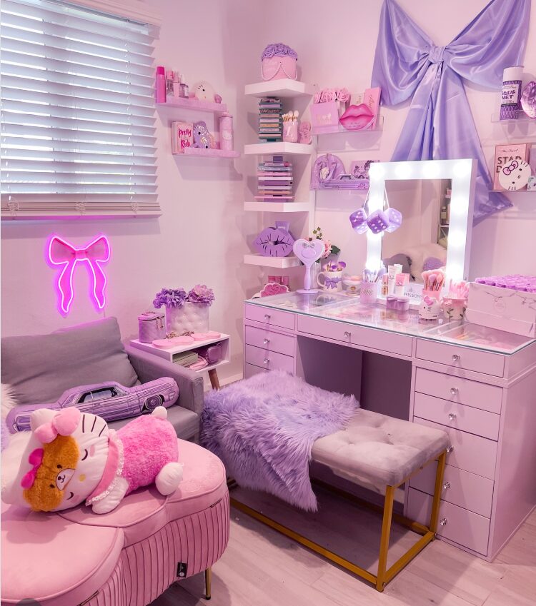 This beauty corner brings coquette glam energy with a plush blush chair paired with a lit vanity — perfect for both everyday makeup routines and content creation.