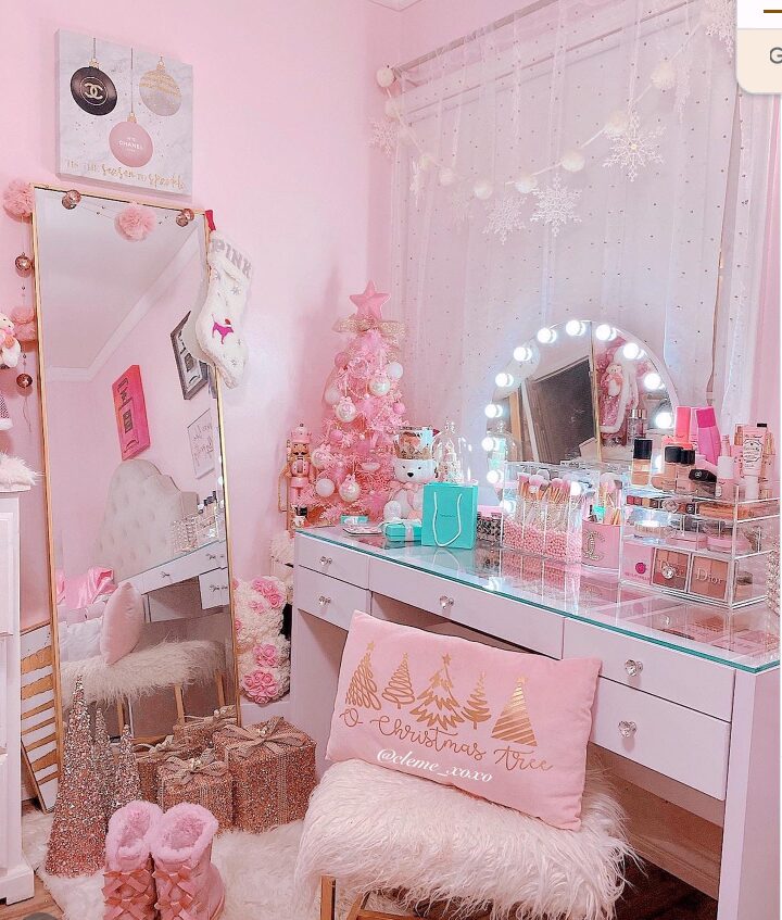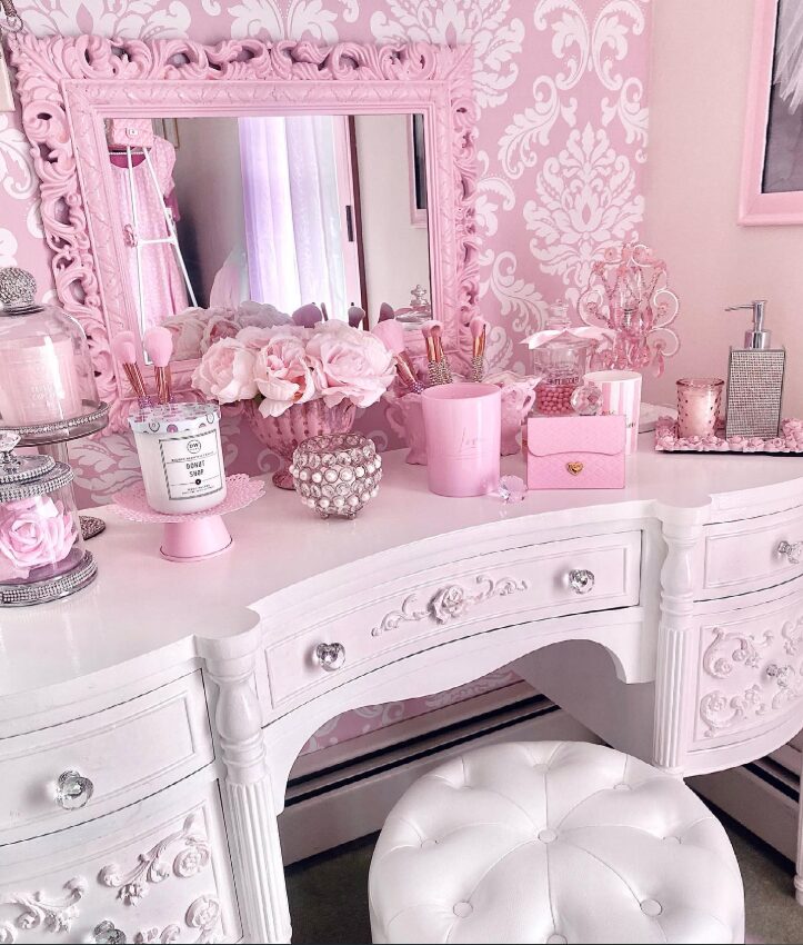 This setup leans into pink aesthetic beauty room goals with a blush-toned vanity corner, glitter accents, and plush finishes that feel like a sugary dream.
