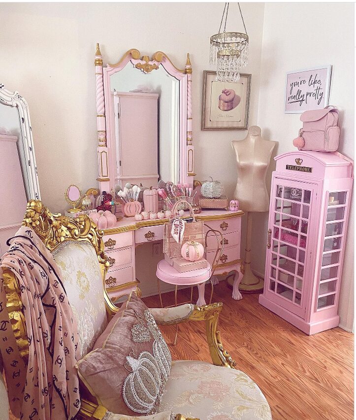 Start by choosing a soft pastel palette and layering textures like velvet, lace, or satin. Add statement mirrors, plush chairs, decorative shelves, and soft lighting to create depth, then include accessories like perfume displays, framed art, and curated trinkets for personality.
