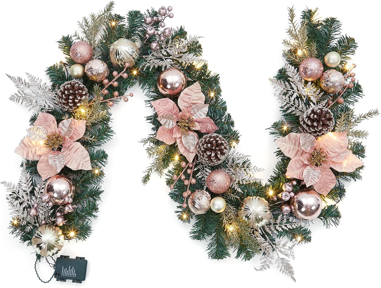 Make your house bright with this 6-foot prelit Christmas garland with 20 LED lights, pinecones, and rose gold ball ornaments.