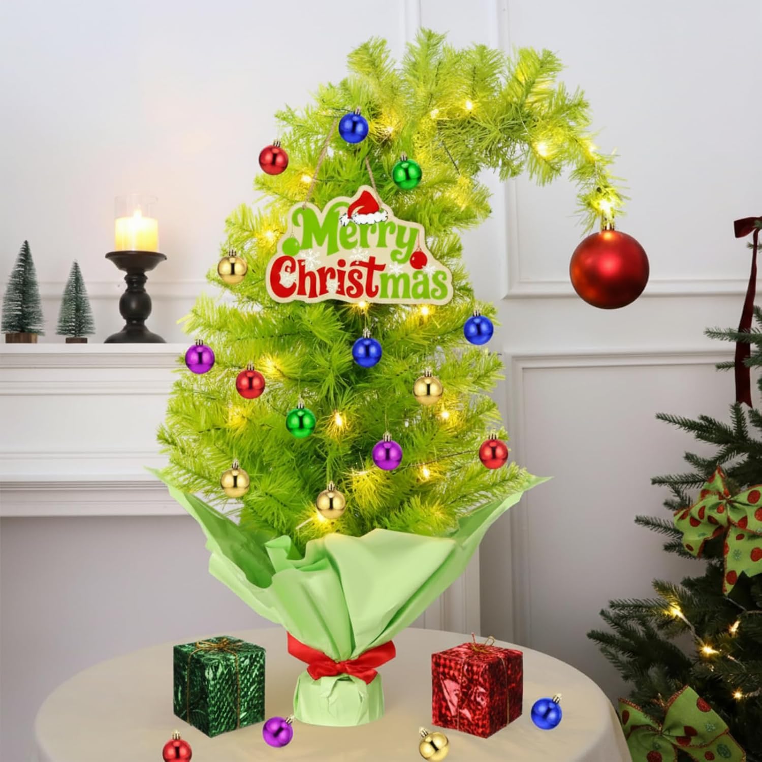 The Realspring 2 ft Whimsical Tabletop Christmas Tree adds a burst of color and joy to any small space. Its lime green hue and bendable branches make it a fun and creative piece for your desk, fireplace, or bedside table.