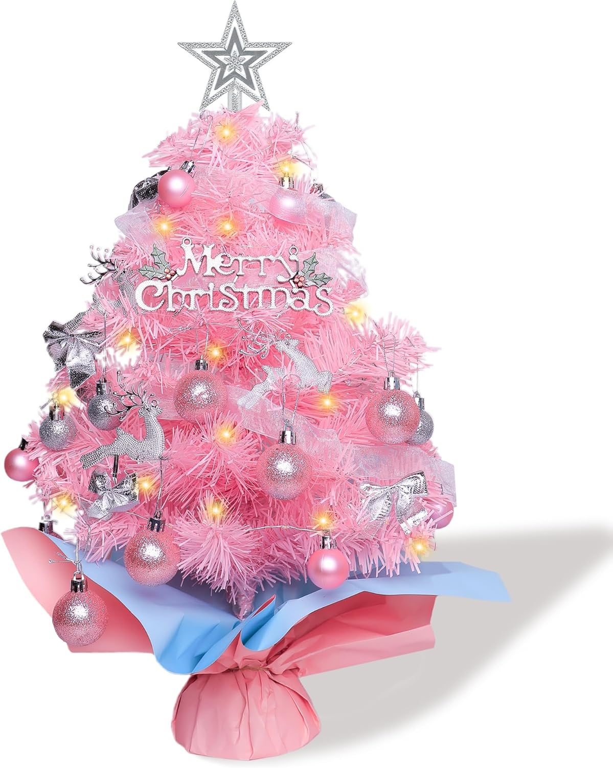 The 24-inch Pink Tabletop Christmas Tree with Lights adds a soft, feminine appeal to your holiday setup. Its gentle pink branches and twinkling lights make it a delightful accent for bedrooms, offices, or cozy corners that need a pop of festive color.