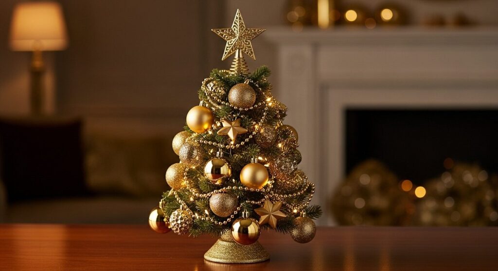 For those who adore luxury, a gold-themed tabletop tree is a must. Shimmering ornaments, metallic ribbons, and pearl accents make your setup feel elegant and festive.