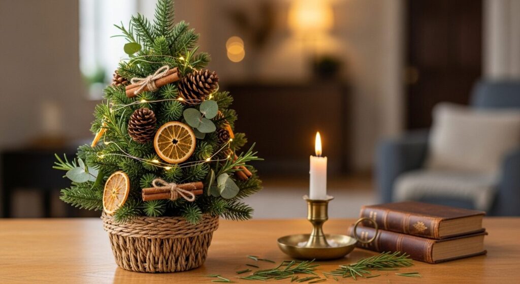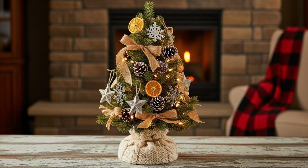 Bring country charm indoors with a farmhouse-inspired tabletop tree. Decorate it with wooden ornaments, plaid ribbons, and miniature pinecones. Add a star or burlap bow on top to complete the down-to-earth look.