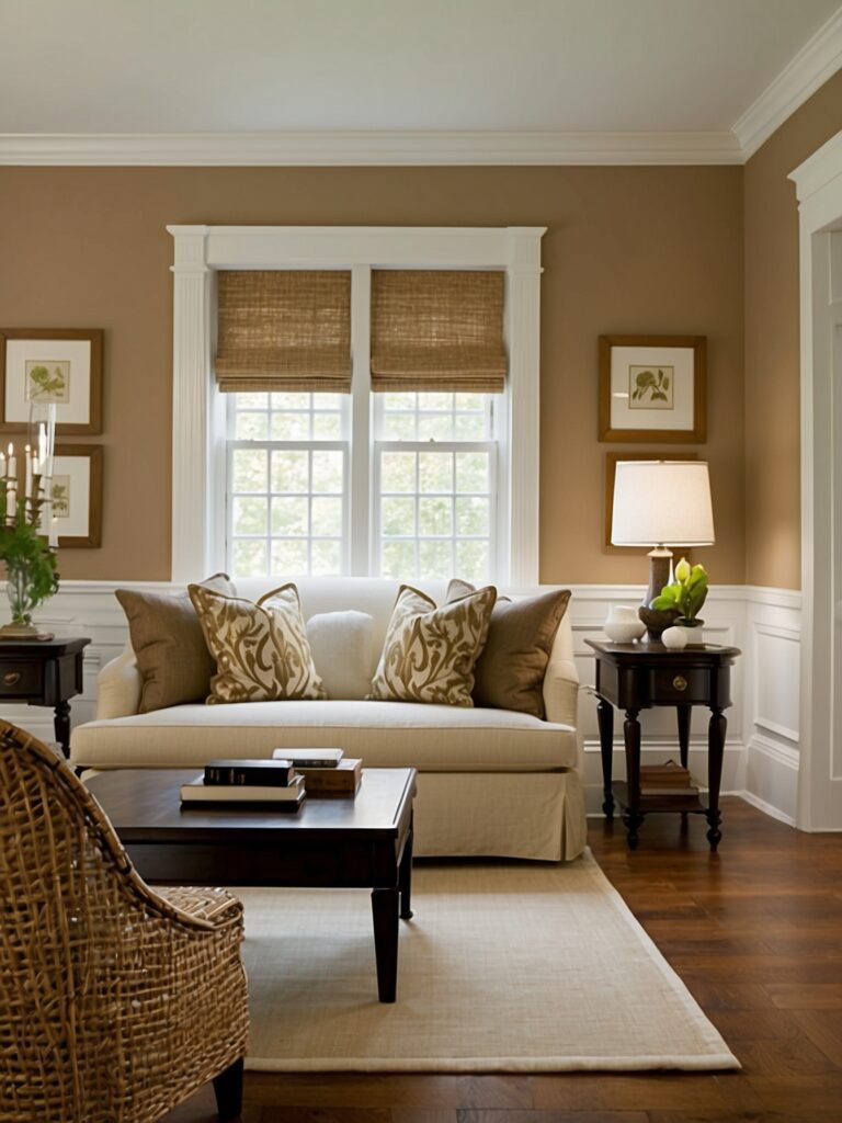 Tan walls do not make a living room look dark when paired with proper lighting and lighter furniture. Choosing light tan shades, white trim, and layered lighting keeps the room bright and balanced.