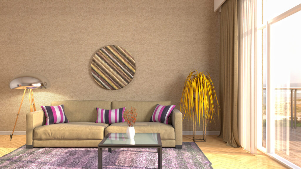 Decorate a tan living room wall by layering neutral furniture, adding texture with rugs and pillows, and using contrast with black, wood, or metallic accents. Greenery and artwork also enhance tan walls beautifully.