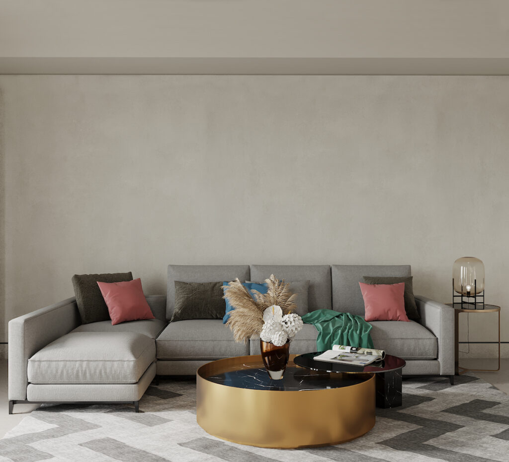 Gray furniture cools down tan walls while maintaining a neutral palette.