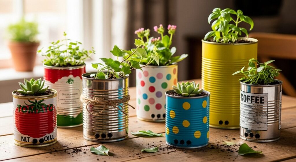 If you’re into zero-waste gardening, tin cans are the ultimate recycled planter option. They’re easy to find, easy to decorate, and absolutely budget-friendly.