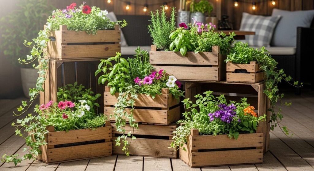 If you’ve ever bought fruit or wine in wooden crates, don’t throw them away. They make the most versatile planters you can imagine. Their natural wood texture fits beautifully into any sustainable garden décor setup — indoors or outdoors.