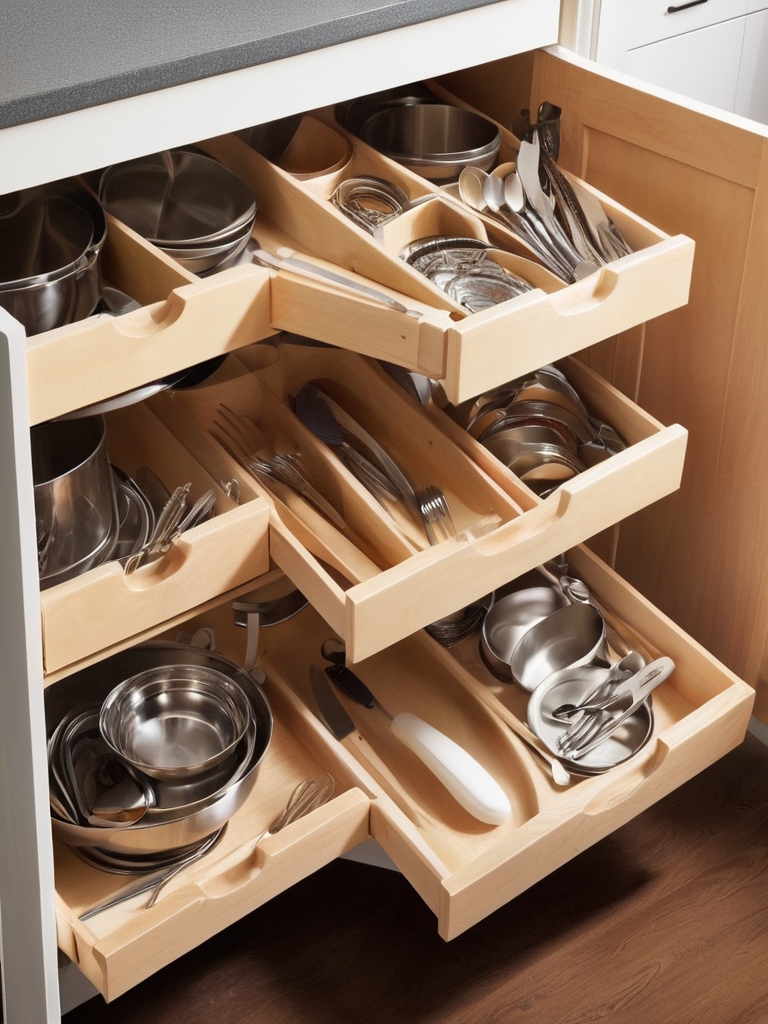 Deep cabinets can be challenging to navigate, especially when storing small utensils. Pull-out drawer trays solve this problem by bringing your tools to you.
