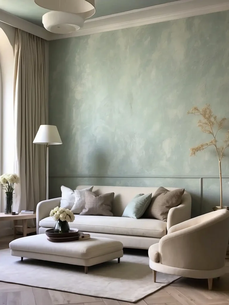 Plaster-style wall coverings add artistic, handmade depth with tonal variation.