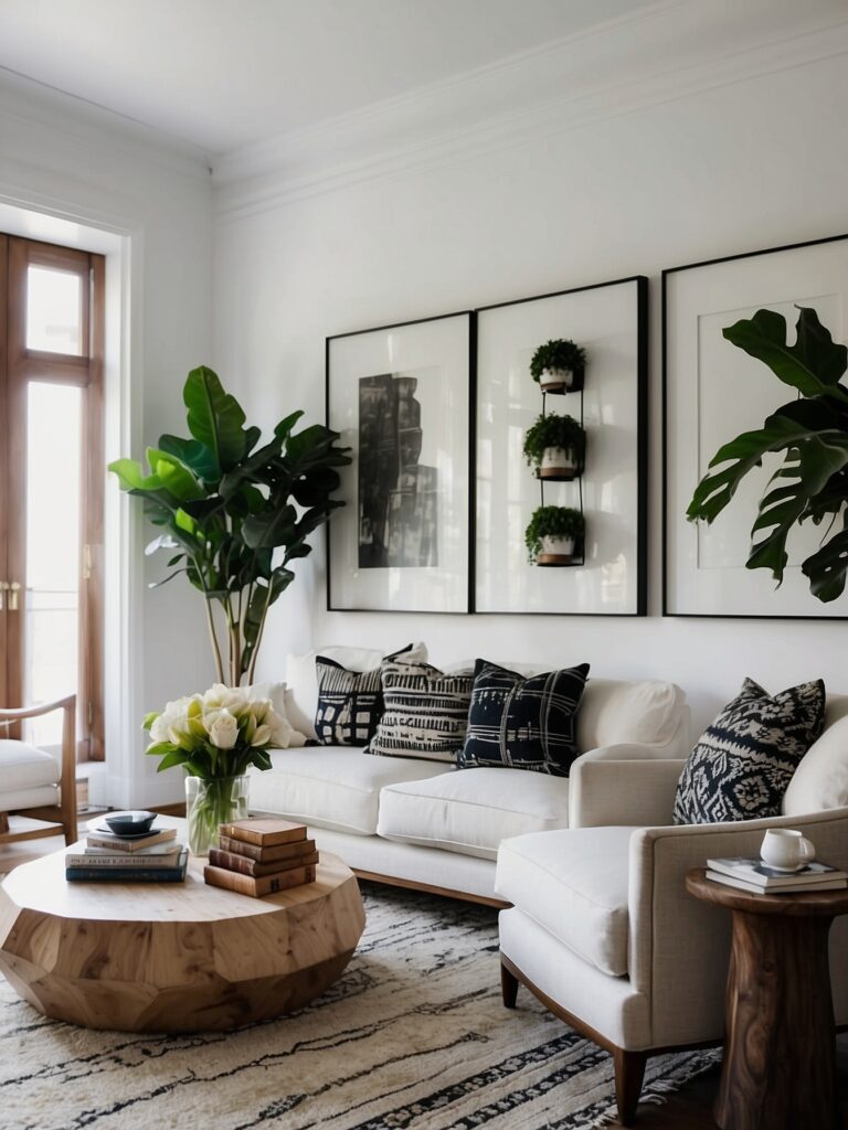 Use layered textures, warm lighting, wood accents, and soft neutral furniture. These elements balance white walls and add comfort.